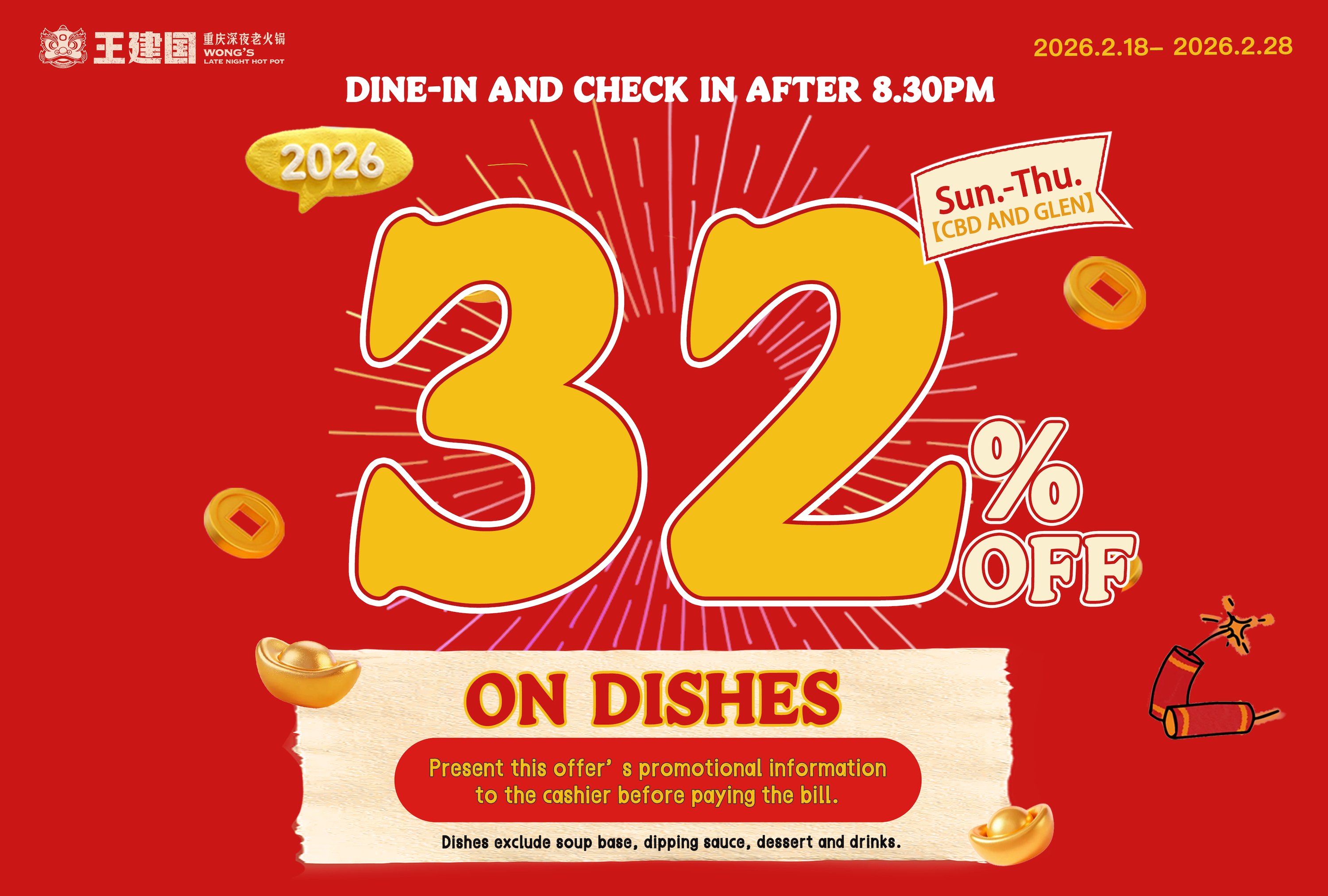 2月18日至28日,春节来王建国堂食就送【新年刮刮乐】1张!
